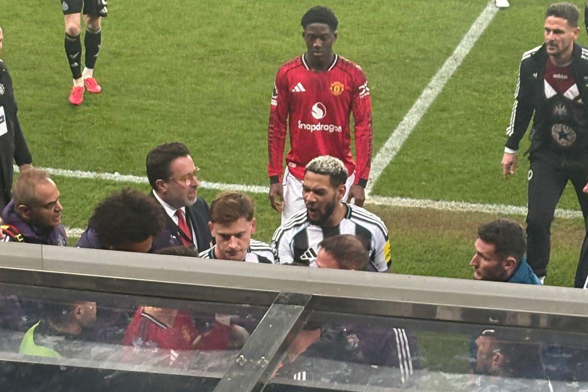 B费与乔林顿互呛,两人被强行隔开。B费用手指着这位纽卡斯尔联的强硬中场,或许是在提醒他能留在场上已是侥幸。